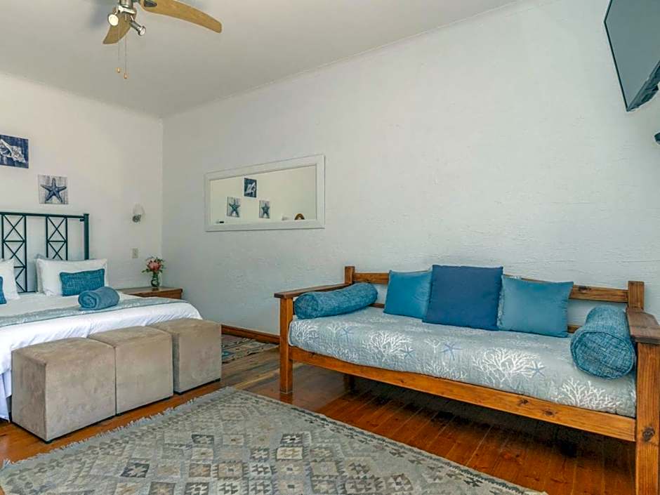 Spacious room with a queen-size bed and single day bed. The room has unique furnishings and paintings, as well as a private entrance and bathroom with bath and shower.
